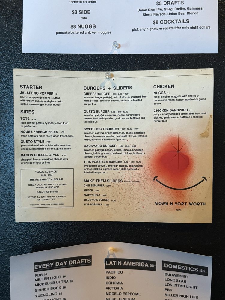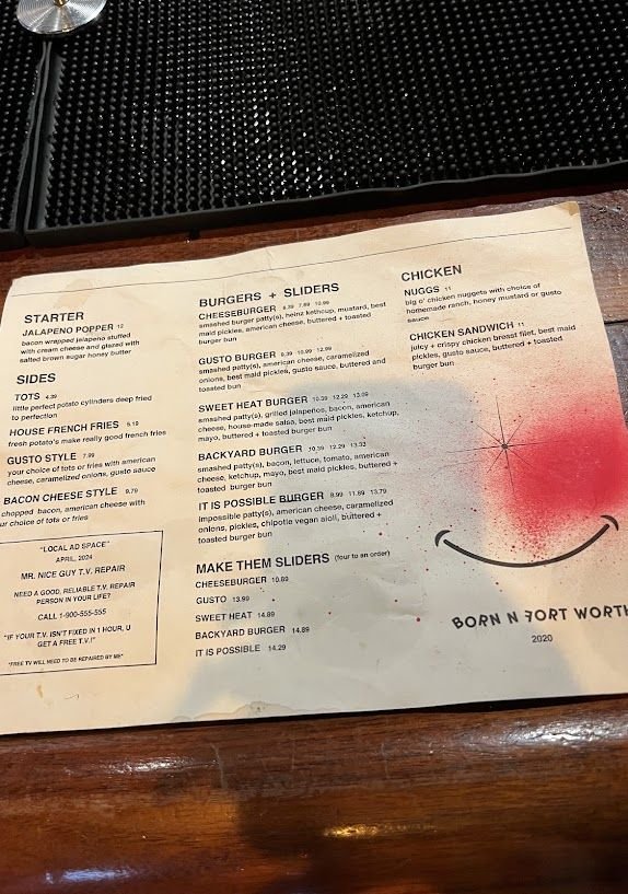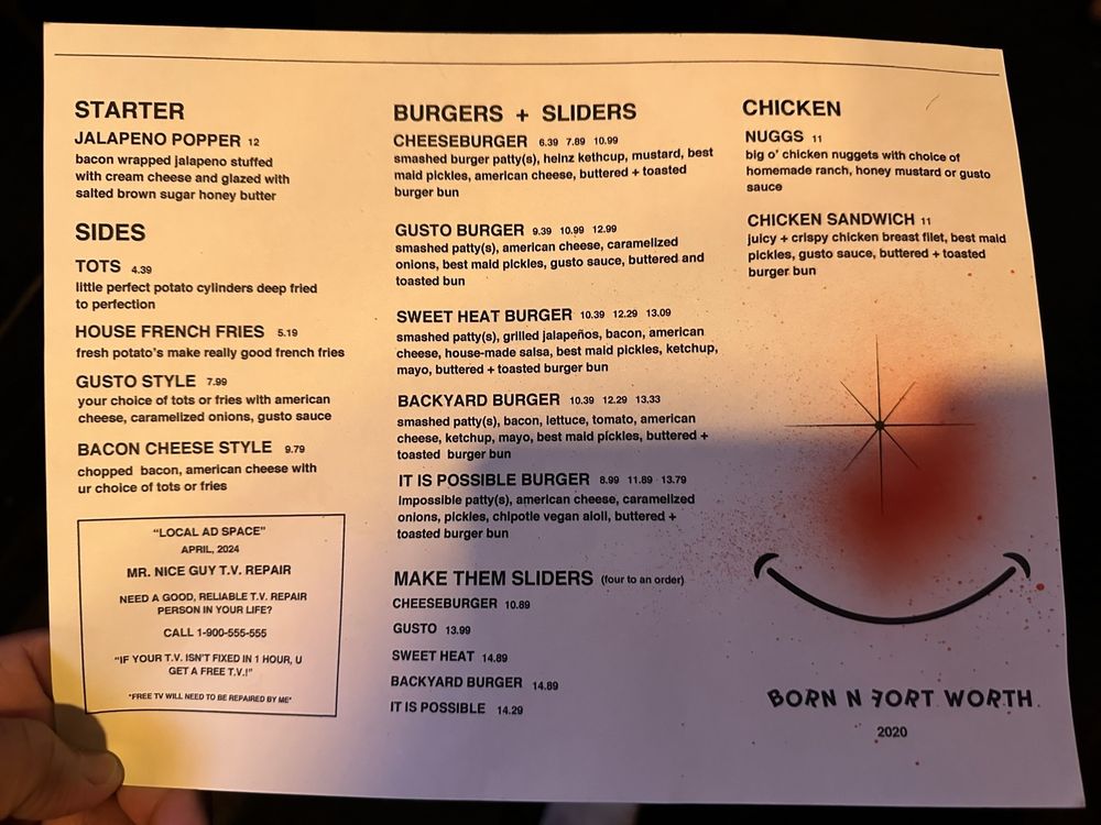 GUSTOS burgers N stuff, located in Fort Worth, TX, offers a trendy and inviting atmosphere for burger enthusiasts. The menu features a variety of options, including the signature Gusto Sliders, flavorful Cheeseburgers, and a Vegan Gusto Burger for plant-based eaters. The Snack n Share section offers tasty choices like Fancy Grilled Cheese and Loaded Veg Tots. Customers rave about the quality of their smash burgers, with crispy edges and juicy patties. The prices are reasonable, considering the exceptional taste and freshness of the ingredients. The outdoor seating with heaters adds to the overall dining experience. With friendly staff and a wide selection of beer options, Gustos Burgers is a must-visit spot for those craving a delicious burger fix.